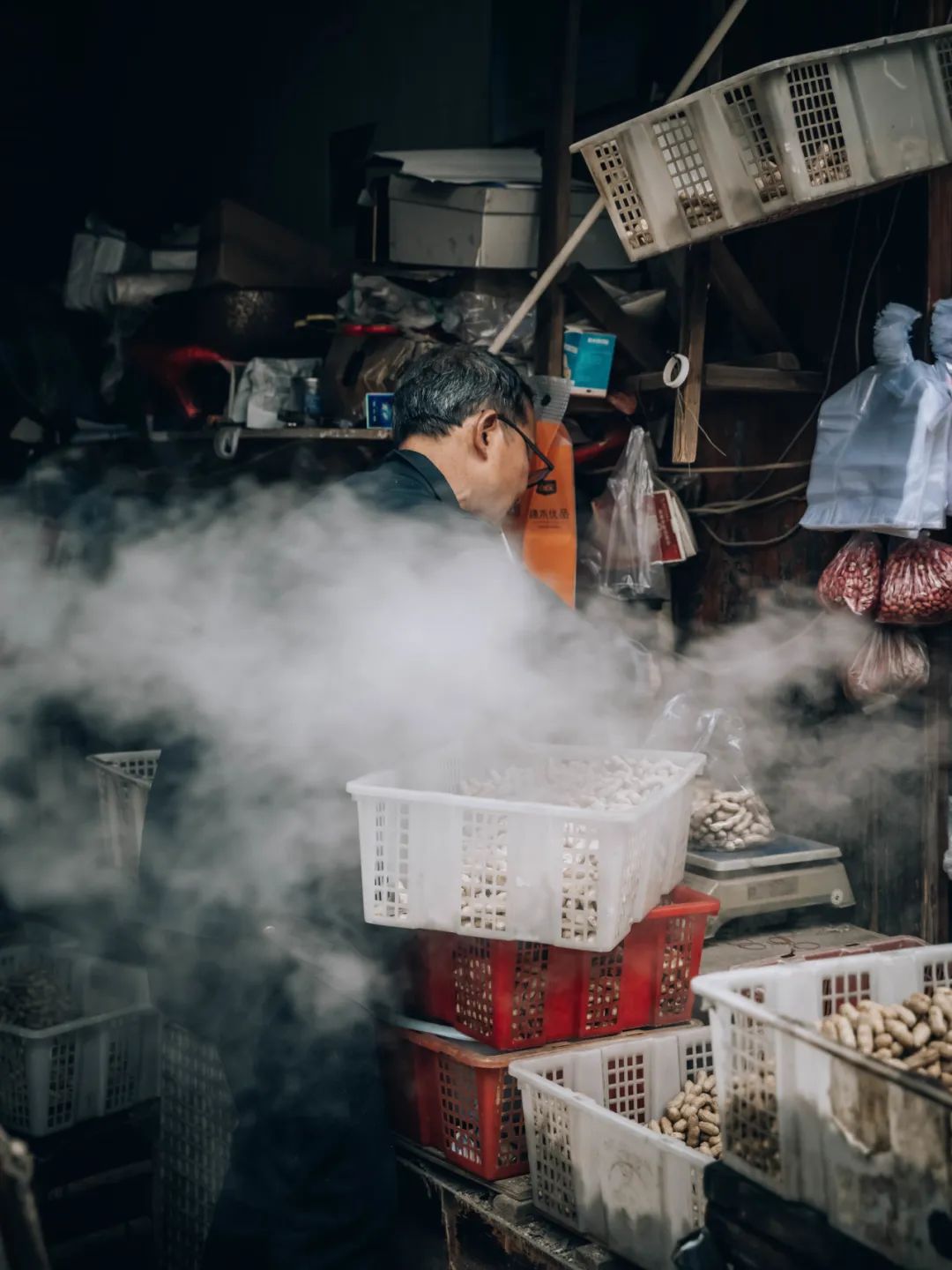 现在蒸一笼花生,大概五十分钟左右便可以出一锅,而为了能产出更多的花生,我的店门已经十几年没有关门了,连晚上也是敞开的,在店里椅子一摆好,被子盖上去就可以休息一下。平时我们早上两三点就要起床,最少睡觉就是两个半小时,一般不会超过五个小时。