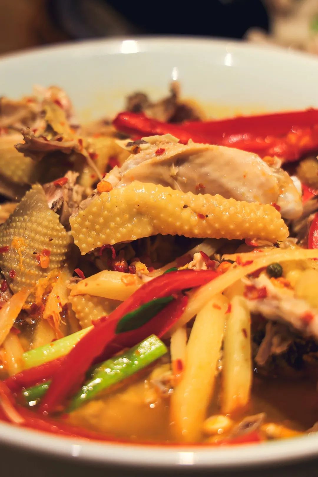 但要想吃到它最本真的滋味,还是得到东安县的芦洪市镇来,本地放养的子鸡生活在乡间田野,喝着露水吃着小虫长大,肉质柔嫩不腥;本地东安鸡味觉上的的点睛之笔,一定是自家用稻米酿的醋,光是拈起坛子盖都能闻到浓香,是工厂的白醋难以达到的醇鲜,下进菜里酸不刺口;外加上仔姜和红辣椒提香增鲜,酸与辣两重滋味就此而成。东安鸡口味上符合湖南人的脾性,但鸡肉嫩滑的口感,倒也意外地合广东食客的胃口,不少广府游客也会特地来尝鲜。