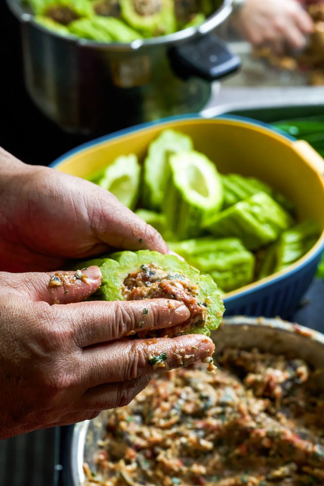 鲜辣的鸡鸭鱼肉味道虽好,但也容易吃得肉气攻心,好在永州还有很多滋补佳肴,共同构成饮食上的调和之道。聚居于永州山区的瑶家人和客家人,把自然的馈赠通通端上餐桌,成就了一种舌尖上的清爽美味——酿菜。在酿菜的制作手法中,会将素菜挖成空心,填入肉馅再烹熟,荤素相合,相当解油解腻。最完整的江华十八酿,包括酿苦瓜、酿豆腐、酿丝瓜、酿辣椒等十八道菜色,辣椒的辣味,在肉馅的包裹中变得不再锐利,苦瓜虽苦,却也被肉馅很好地中和......小小的一盘酿菜之中,凸显着永州人五味调和的真谛。