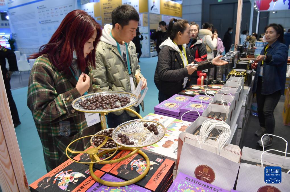 11月16日,观众在第七届丝博会印度尼西亚展位上参观选购食品。