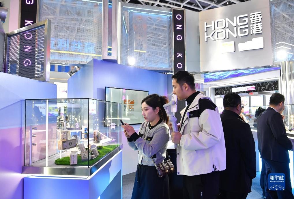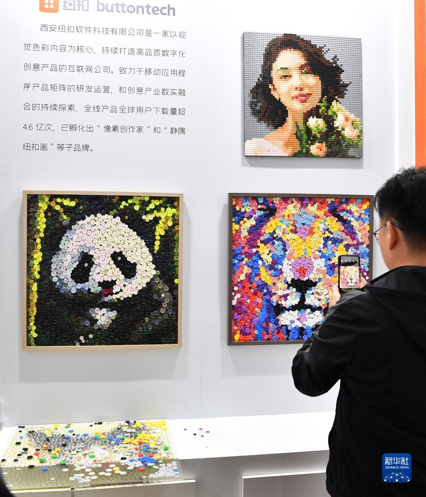11月16日,观众在第七届丝博会上参观由纽扣制作的文创产品。