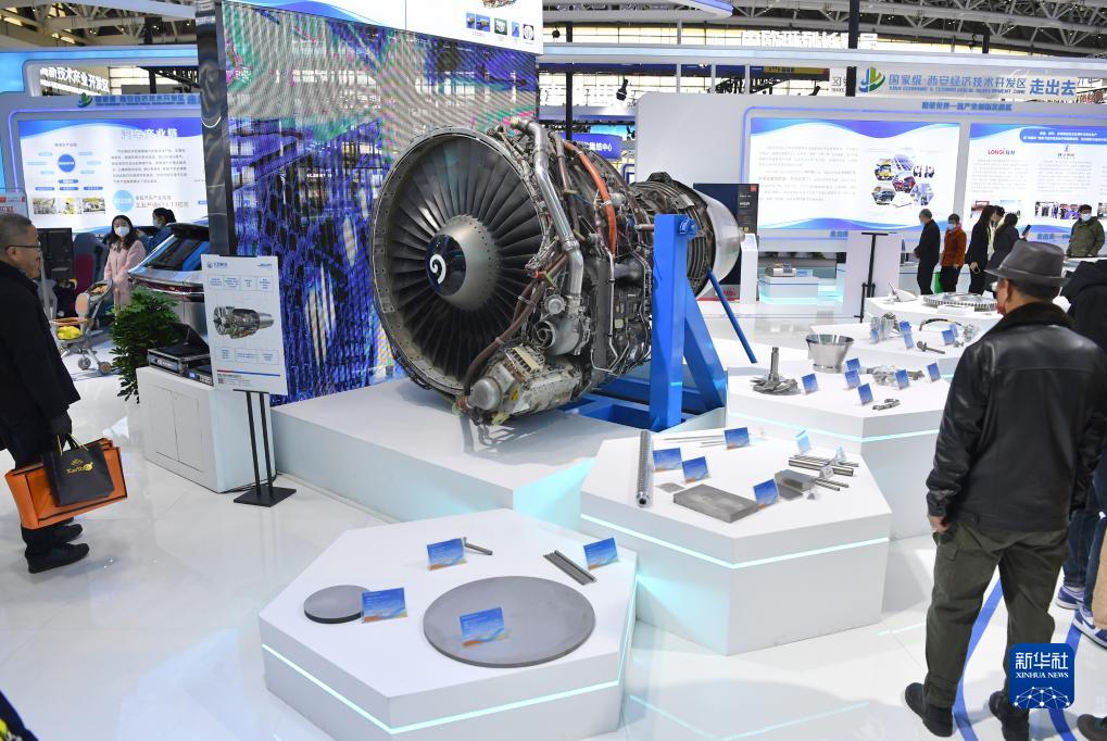 11月16日,观众在第七届丝博会上参观一款航空发动机。