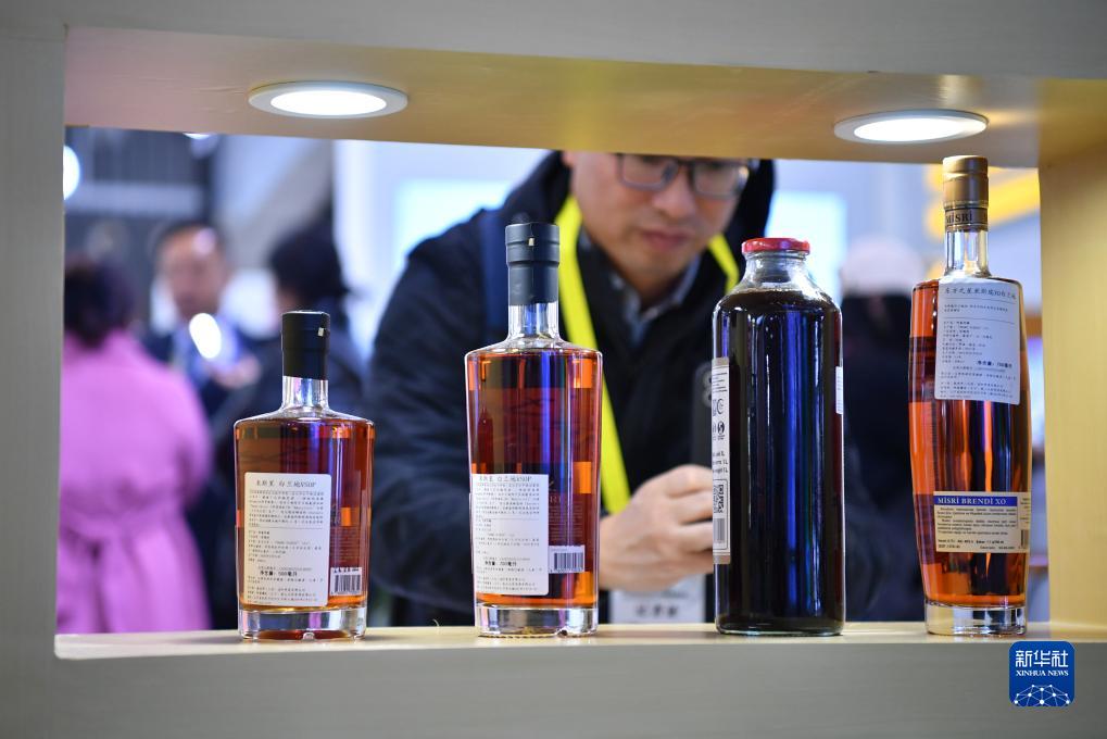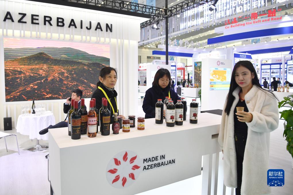 11月16日,观众在第七届丝博会上参观阿塞拜疆展位上的酒水产品。