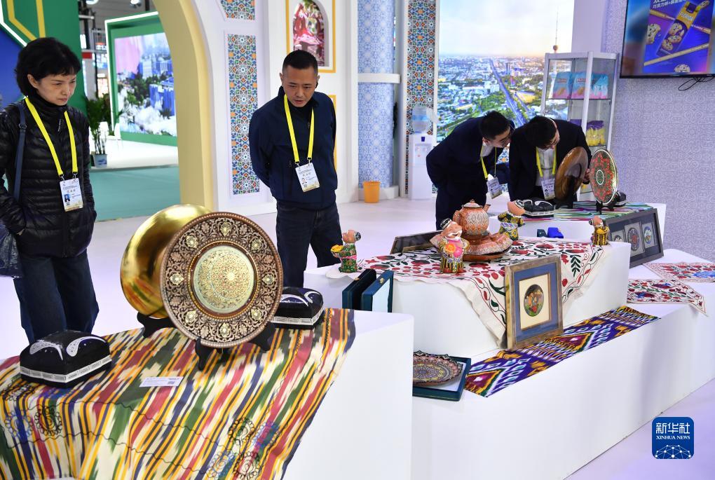 11月16日,观众在第七届丝博会乌兹别克斯坦展位上参观工艺品。