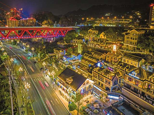 夜幕降临,龙门浩老街灯火通明,市民游客逛街打卡 摄/郭旭