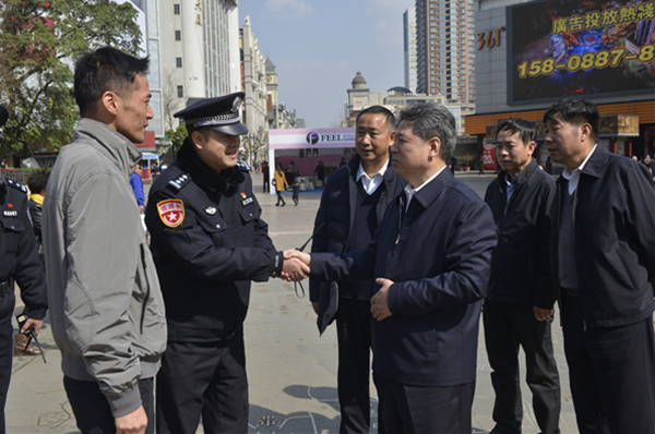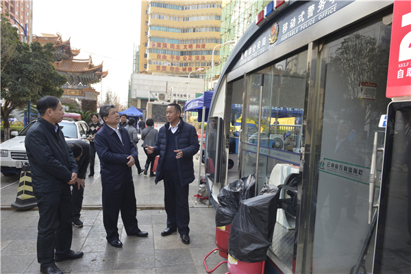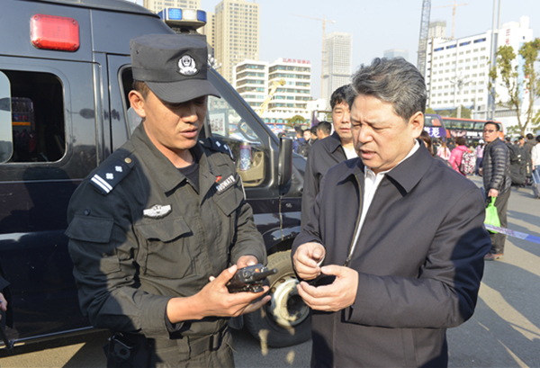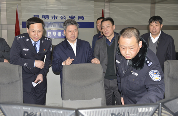 任军号同志先后深入昆明火车站、南窑汽车站、北京路派出所、金碧广场、南屏街广场、塘子巷地铁站、昆明市公安局指挥中心等地,首先通过现场拨打110报警电话检查了联勤联动指挥勤务模式运行情况,实地察看了警力资源配置、值班备勤和在岗在位、重点部位安检、警务装备配备情况,听取了流动人员管理、应急安全防范和处置警情数量、类型等情况汇报,随机检查了工作台账,并在昆明市公安局指挥中心调度了全市公安执勤情况。