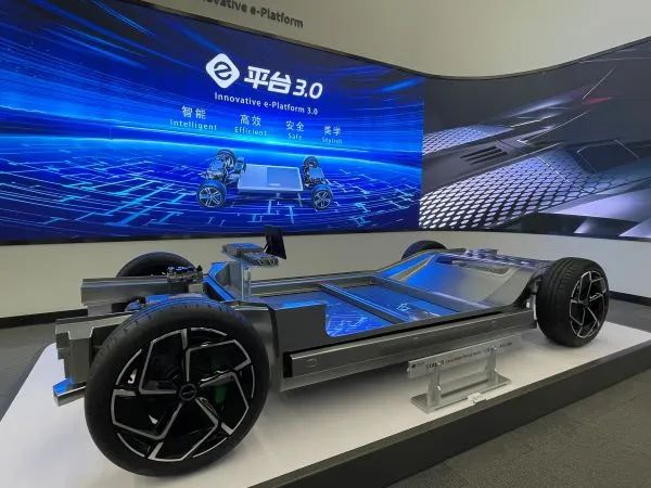 //比亚迪公司展出自主研发的新能源汽车底盘。图/第一财经