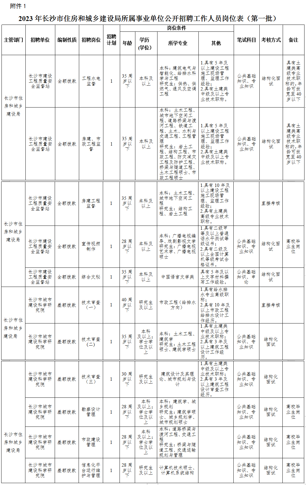 1. 2023年长沙市住房和城乡建设局所属事业单位公开招聘工作人员岗位表(第一批)