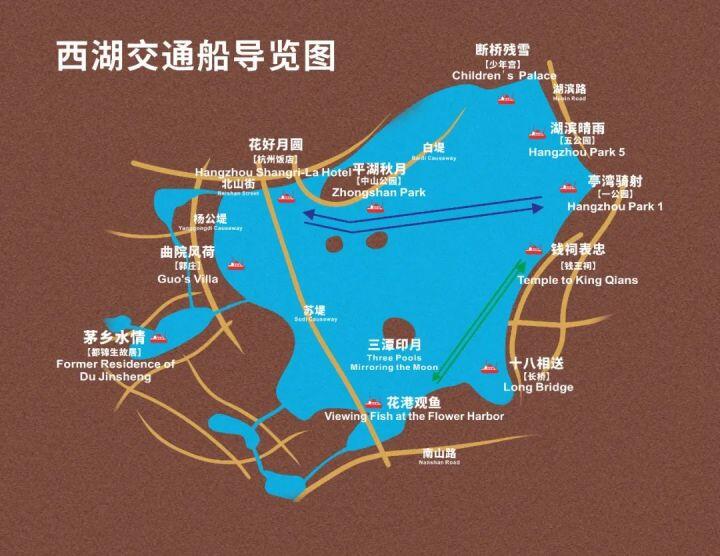 售票及乘船码头:一公园、杭州饭店、花港观鱼、钱王祠。