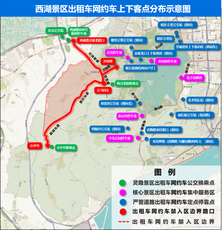 5.灵隐区域出租车、网约车禁止驶入期间,在西溪路608号停车场、东岳公交首末站(天目山路紫金港路口东南角)内设置出租车、网约车上下客点,乘客可通过换乘公交车辆进入灵隐区域。