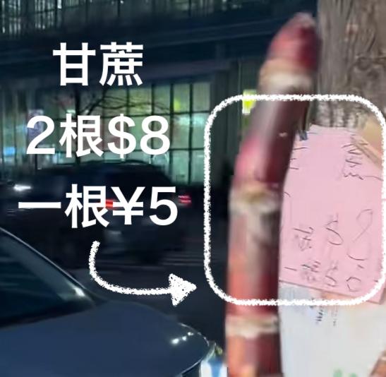 得益于这些官媒转发与网友热议,笔者也从中发现了更多令人“细思极恐”的细节。比如商贩粘贴在树上的海报显示这些甘蔗“5美元1根,8美元两根”。