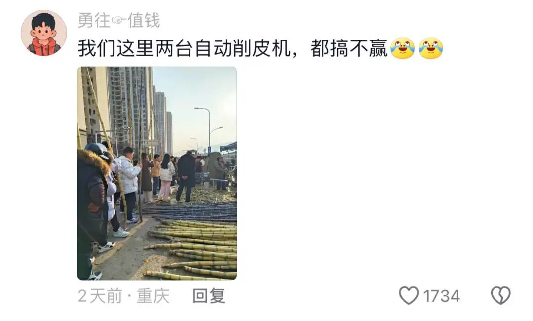 至于啃腻了绿皮黑皮各种皮的甘蔗的国内网友,更是忍不住调侃。因为国内卖甘蔗早就用上了专业的自动化机器来削皮,但是要想搞赢其他同行的话,可不像视频里的法拉盛大哥那么容易的。