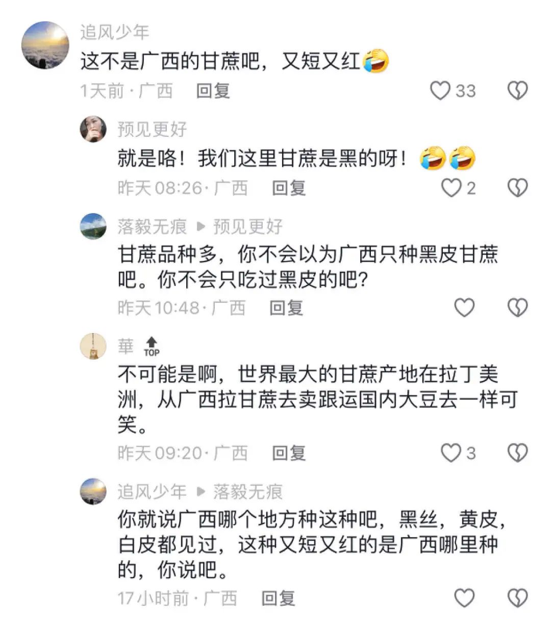 关于视频中的甘蔗是否Made in Guangxi,我们有待商榷。但可以肯定的是,眼尖的广西老表早已发现这种甘蔗像极了广西产的黑皮甘蔗,否则“桂系官媒”也不会看了视频就踊跃转发。
