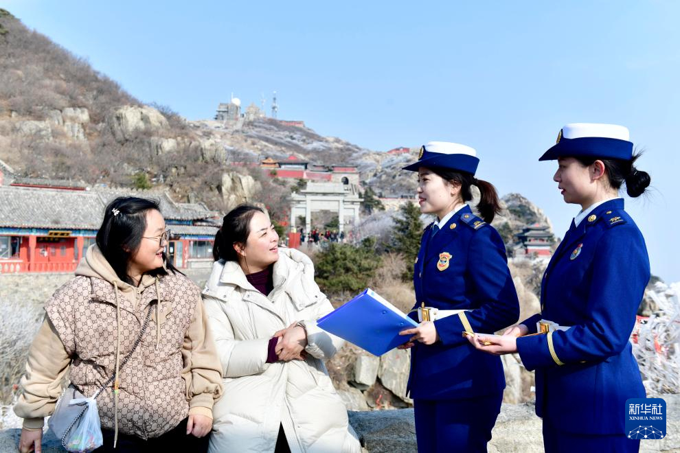 3月6日,在泰山天街,泰山消防女子巡查服务队的女指战员进行消防巡查并叮嘱游客要注意防火安全。