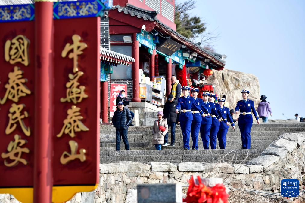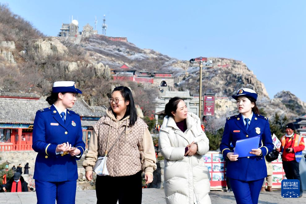3月6日,在泰山天街,泰山消防女子巡查服务队的女指战员在执勤。