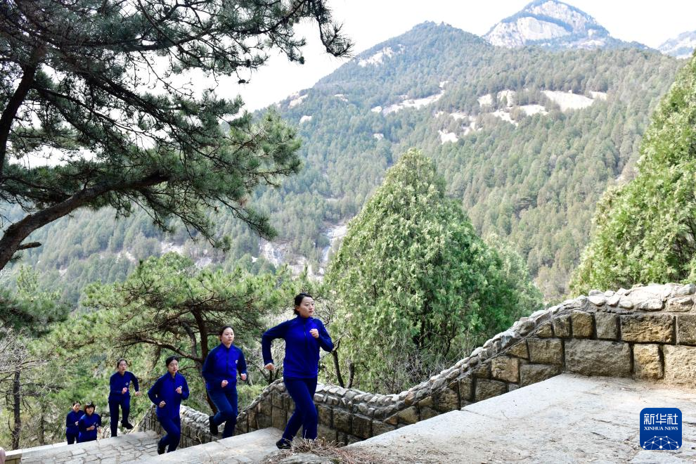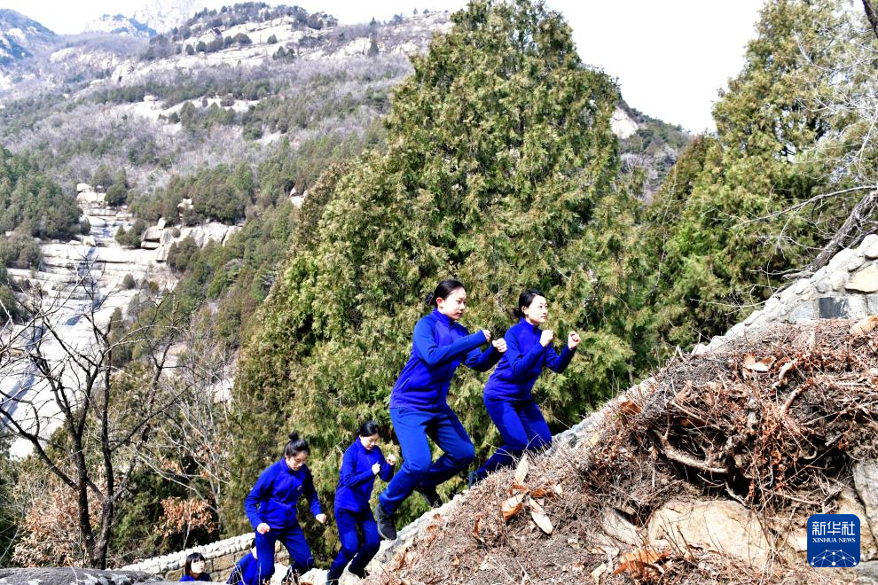 3月6日,在泰山,泰山消防女子巡查服务队的女指战员进行体能训练。
