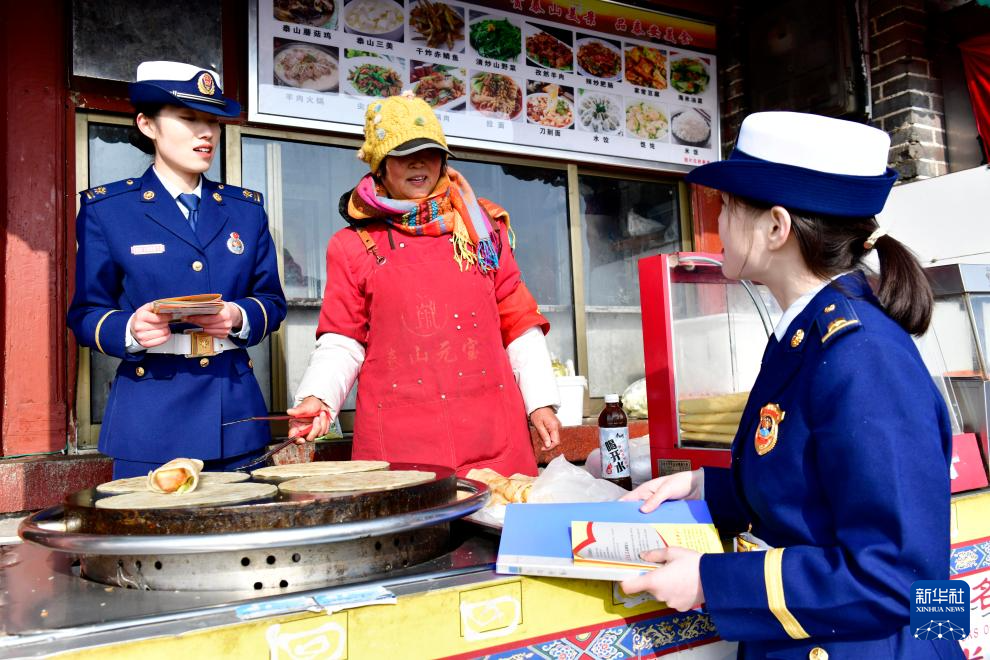 3月6日,在泰山天街,泰山消防女子巡查服务队的女指战员进行消防巡查并叮嘱商户要注意防火安全。