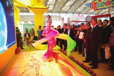 展览一开始,甘肃展台就凭借独具特色的展台设计和美轮美奂的文艺演出成为展馆名副其实的“人气王”,雄浑激昂的天水扇子舞,清秀婉转的裕固族歌舞,热情奔放的阿克塞弹唱,婀娜多姿的敦煌舞,原生独特的白马藏族歌舞,一次次将展示活动推向了高潮,甘肃展台一度被观展和咨询的游客拥堵,仅首日发放资料5万余份。