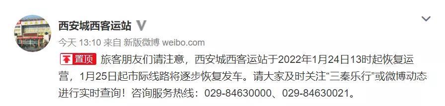 今天(24日)中午,西安城西客运站发布公告:旅客朋友们请注意,西安城西客运站于2022年1月24日13时起恢复运营,1月25日起市际线路将逐步恢复发车。请大家及时关注“三秦乐行”或微博动态进行实时查询!咨询服务热线:029-84630000、029-84630021。