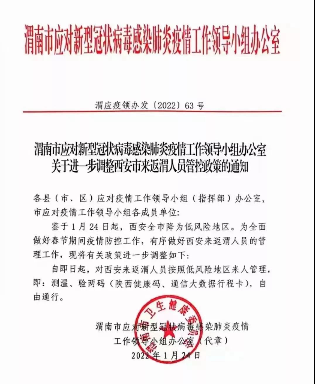 鉴于1月24日起,西安全市降为低风险地区。为全面做好春节期间疫情防控工作,有序做好西安来返渭人员的管理工作,现将有关政策进一步调整如下: 自即日起,对西安来返渭人员按照低风险地区来人管理即:测温、验两码(陕西健康码、通信大数据行程卡),自由通行。 24日中午12时许,华商报记者从渭南西高速口得知,西安人员返渭只需出示48小时核酸阴性检测报告、行程卡、健康码即可通行。