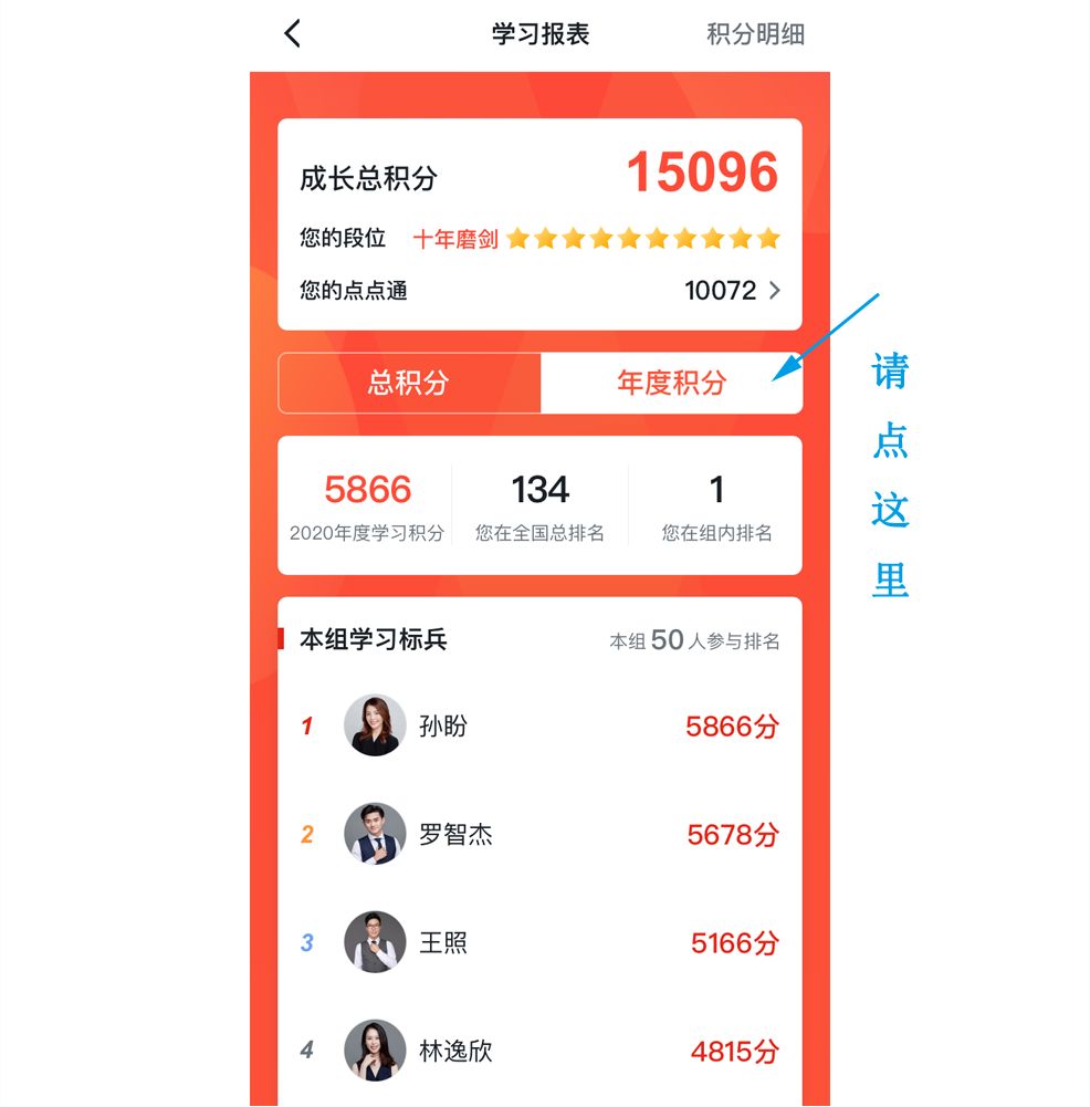 2020年1月2日后,在“我的-学习报表”中,既可查询历史总积分,又可查询2020年度积分。你可以通过如下操作查看自己的年度积分: