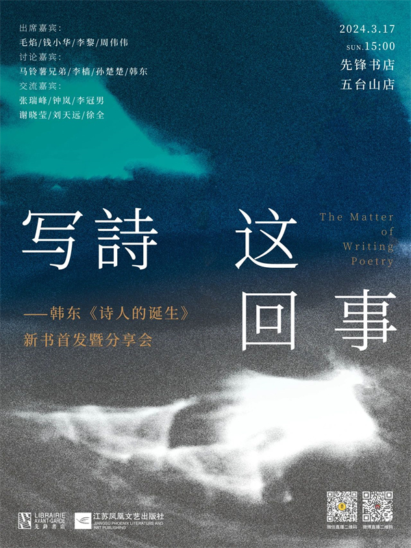 3月17日,我们邀请到《诗人的诞生:韩东的诗歌课》作者、诗人韩东,以及艺术家、画家、诗人毛焰,先锋书店创始人钱小华,江苏凤凰文艺出版社副总编辑李黎等嘉宾,做客南京先锋书店五台山总店,与大家聊聊“写诗这回事”,在春日的下午一起深情拥抱当代汉语诗歌。