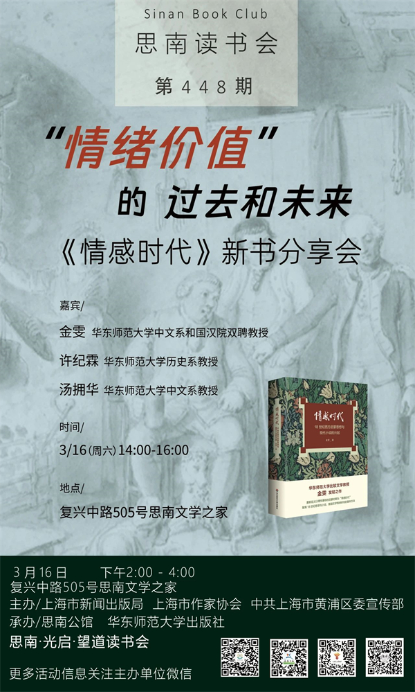 18世纪是现代公共领域崛起的时期,也是情感理念和情感教育变得非常重要的时期。在《情感时代:18世纪西方启蒙思想与现代小说的兴起》中,金雯教授重新定义以理性著称的启蒙时期为“情感时代”,深入剖析情感的意义以及对当下社会的启示。3月16日下午,让我们跟随知名学者金雯、许纪霖、汤拥华的步伐,追溯“情绪价值”的过去,展望“情绪价值”的未来。