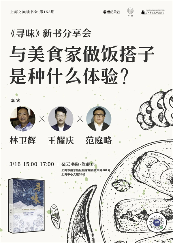 3月16日下午,在朵云书院·旗舰店,《寻味》作者、美食顾问、食评人林卫辉,演员、美食达人王耀庆,图书出版人范庭略,将带来一场关于美馔佳肴的对谈,引领我们一起畅游美食国度,“品鉴”令人食指大动的人间盛宴。