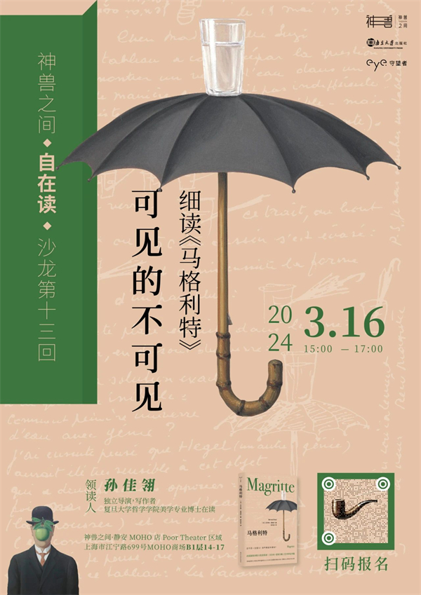 《马格利特》是法国国家诗歌大奖获得者贝尔纳·诺埃尔的艺术评论作品。作者以深刻的洞察力对马格利特的代表性作品进行了富有创造性和启发性的评论、赏析,同时也对超现实主义在当代的影响和意义进行了清晰有力的阐释。3月16日下午,独立导演、写作者、复旦大学哲学学院美学专业在读博士孙佳翎将来到神兽之间静安MOHO店,和大家一起讨论马格利特的绘画作品以及诺埃尔的评论文本。