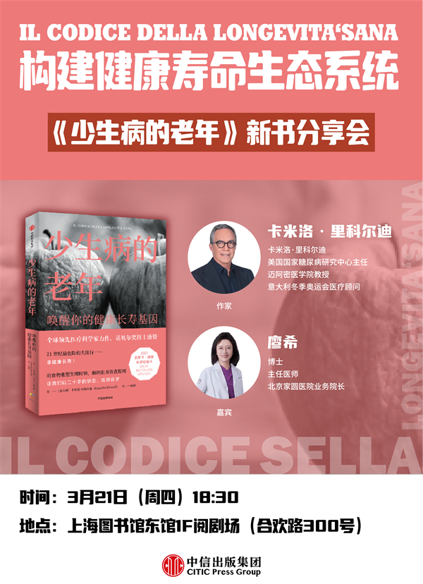 3月21日,上海图书馆将举行健康科普书《少生病的老年》新书签售会。作者卡米洛是细胞移植和再生医学领域的世界领先科学家之一,米兰奥运会唯一首席医疗官,主要研究的方向包括逆转自身免疫疾病、移植耐受性、免疫和炎症调节、预防或治疗慢性退行性疾病的再生医学,以及延长健康寿命等领域。作者在本书向读者展示了如何通过改善生活方式、饮食和保护分子来预防和逆转衰老,延长健康寿命,并对抗21世纪的三大流行病:非健康衰老、自身免疫性疾病和新型冠状病毒感染。