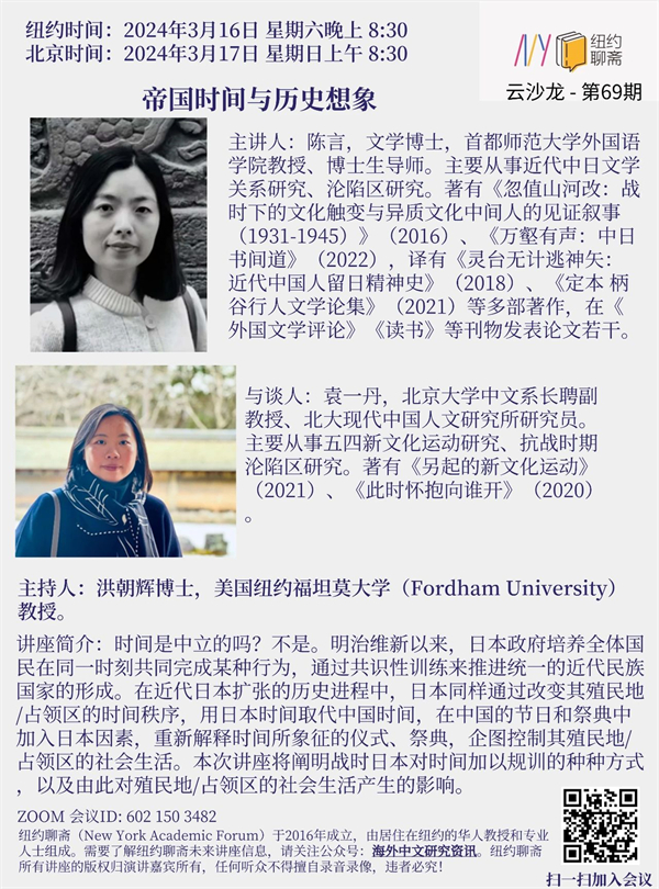 时间是中立的吗?不是。明治维新以来,日本政府培养全体国民在同一时刻共同完成某种行为,通过共识性训练来推进统一的近代民族国家的形成。在近代日本扩张的历史进程中,日本同样通过改变其殖民地/占领区的时间秩序,用日本时间取代中国时间,在中国的节日和祭典中加入日本因素,重新解释时间所象征的仪式、祭典,企图控制其殖民地/占领区的社会生活。本次讲座将阐明战时日本对时间加以规训的种种方式,以及由此对殖民地/占领区的社会生活产生的影响。