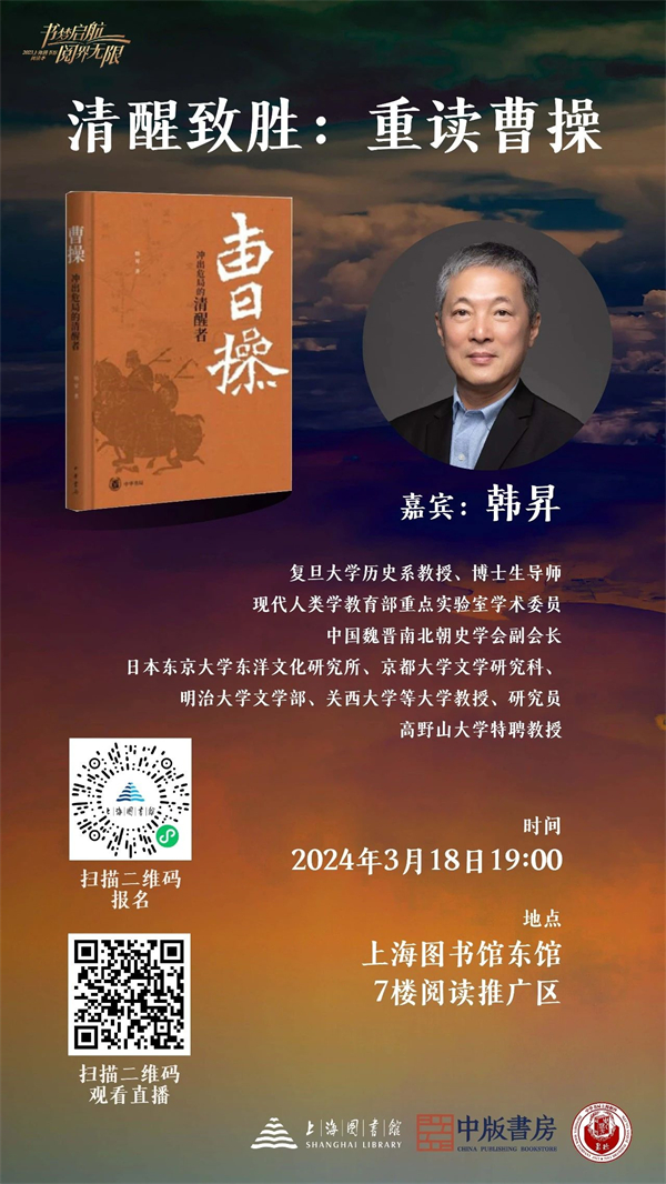3月18日,复旦大学历史系教授、《曹操:冲出危局的清醒者》作者韩昇将来到上海图书馆东馆,为读者带来“清醒致胜:重读曹操”的讲座活动,从历史的细节出发,重新解读一代风流人物曹操在乱世冲出危局的密码。