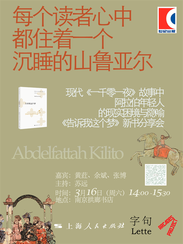摩洛哥作家阿卜杜勒法塔赫·基利托的《告诉我这个梦》再次编织起一座有关《一千零一夜》的“文学的迷宫”。在这里,时间变得模糊不清,人物与过去相遇、与未来交织,同时,这趟旅程充满谜团,进入其中,既能陷入到对阿拉伯世界的无尽遐想中,也会体验到故事迷宫中现代都市阿拉伯年轻人无法言说的困境与思绪。3月16日下午,拱廊书店邀请知名法语学者黄荭教授、比较文学学者博导余斌、法国文学学者张博,就《告诉我这个梦》这本书,一起来聊一聊《一千零一夜》与基利托的《告诉我这个梦》中阿拉伯现代年轻人的现实困境与隐喻,以及这本书对现实与虚构、文学批评与叙事之间的界限的探索。