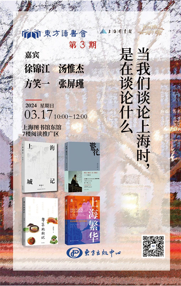 当我们谈论上海时,我们在谈论什么?我们不仅是在讨论一个地理位置,更是关注其作为国际化大都市的成长轨迹、丰富的文化内蕴、复杂的社会变迁和人文情感的寄托,这些都是构筑上海城市特质的重要元素。3月17日上午,东方读书会邀请到《上海城记》的作者、上海社会科学院城市文化创新研究院院长徐锦江,同济大学人文学院副教授汤惟杰,华东师范大学中文系教授方笑一,同济大学人文学院教授张屏瑾,来共同探讨上海城市文化的历史演变与当代革新。