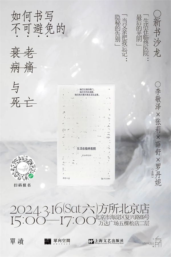 有关衰老、病痛与死亡的一切都是如此残忍,而对此的书写来自于一种无法遏制的冲动。“生命两部曲”第一部《当父亲把我忘记:隐秘的告别》中,作者薛舒的父亲“失控的大脑自行决定退休”,从出现早期症状,到性情大变,最终在精神层面与家庭、亲人彻底告别。第二部《生活在临终医院:最后的光阴》则将关注的视角从父亲个体、家庭内部转移到以临终医院为场景更大的老年病人和护工群体,看生命是何其脆弱,又是何其坚忍。3月16日,薛舒将和作家、评论家李敬泽,北京师范大学文学院教授张莉,本书策划编辑罗丹妮一起来到方所北京店,聊聊作为家人,如何面对至亲之人因为 AD(阿尔茨海默症) 变成一个“什么都不记得,什么都没感觉,什么都不会的傻子”,如何打捞那些正在消失的记忆碎片,而在生命的终点站、一个人最后的光阴里,如何与死亡这件事朝夕相处。