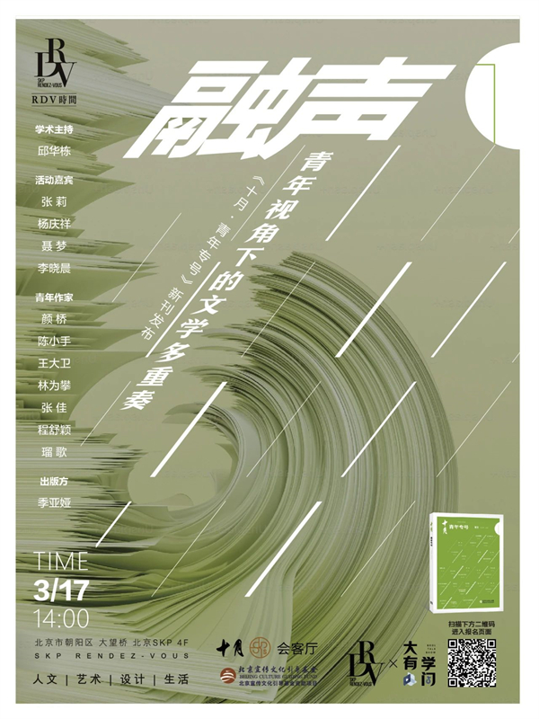 3月17日下午,我们特别邀请邱华栋、张莉、杨庆祥、聂梦、李晓晨、季亚娅等作家、批评家,《十月·青年专号》作者颜桥、陈小手、王大卫、林为攀、张佳、程舒颖、瑠歌一同做客SKP,共论“融声:青年视角下的文学多重奏”。