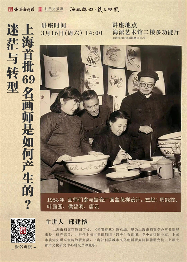 3月16日,海派艺术馆将邀请上海市档案馆原副馆长邢建榕举办“迷茫与转型:上海首批69名画师是如何产生的?”讲座,邢建榕将深入剖析新中国成立后,面对时代风云变幻,上海美术界的自我定位,以及画家们在复杂时代背景下的生活状态与内心感受,并且将重点揭示上海中国画院首批69名画师产生的背景与过程。