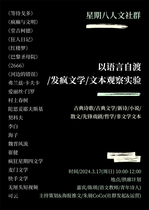 “发疯文学”的概念源自网络,旨在以大量无逻辑的文字堆砌达到情绪宣泄的目的。“与其内耗,不如发疯”等相关标语已成为年轻人标榜自我的社交策略。而在网络媒介之外,“发疯文学”在古典文学、新诗、小说、散文、先锋戏剧与哲学之中则拥有更为广阔的可能,其影响超越国界与时代。创作者们凭借深刻的洞察力,着墨于深入探讨人类心理的边缘状态,缓慢揭开个体内心深处隐秘的伤口。3月17日上午,星期八人文社群将邀请嘉宾陈琪,于拱廊计划内展开对于“发疯文学”的文本观察实验。我们将从“发疯文学”出发,试图剖析文字本身如何成为理解和表达人性的桥梁。