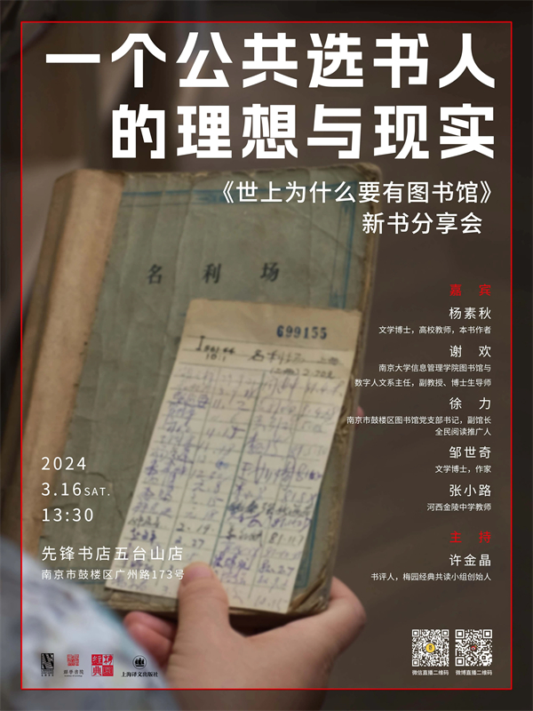 从大学副教授到副局长的身份转换有何种体验?图书馆的书目选择有何故事?图书馆的建设需要迎接何种挑战?3月16日,文学博士、高校教师、《世上为什么要有图书馆》作者杨素秋将携新书做客先锋书店五台山总店,和南京大学谢欢老师、鼓楼区图书馆徐力副馆长、青年作家邹世奇、河西金陵中学张小路老师一同分享、探讨、畅想阅读生活的体验与创造。
