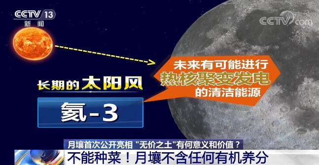 科学家们发现,长期的太阳风给月壤注入了大量的氦-3,这是一种未来有可能进行热核聚变发电的清洁能源。由于地球上有厚厚的大气层,而且有较强的磁场,大部分太阳风都被阻档在外面,所以地球上的氦-3就很少,据研究只有500公斤左右。而研究发现,月壤中含有一百万到五百万吨的氦-3,大概是地球含量的百万到千万倍级。而有研究显示,100吨氦-3所能创造的能源相当于全世界一年消耗的能源总量。