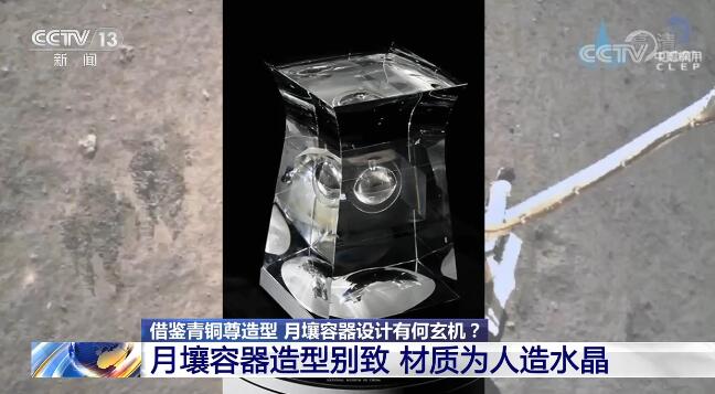 现在我们看到的这个造型别致的容器就是月壤容器。据设计师介绍,容器为人造水晶材质,整体造型借鉴自国博馆藏的系列青铜“尊”,以体现稳重大方之感。