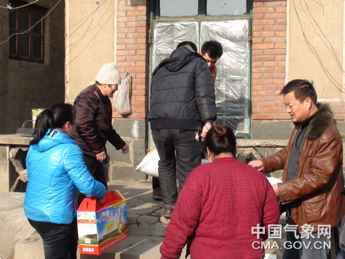 图为气象局工作人员为困难群众送生活用品。张建国摄影