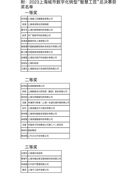在本轮决赛中,上海建工四建集团有限公司余芳强、上海电信移动互联网部吴强、上海杉数网络科技有限公司葛冬冬、中广核数字科技有限公司张秀等10位候选人获得决赛一等奖,达观数据有限公司纪传俊、上海勘察设计研究院(集团)股份有限公司苏辉等10位候选人获得决赛二等奖,上海浦东电信局左艳华等4位候选人获得决赛三等奖。经过信用审核及公示并报组委会审核后,将最终产生10名“智慧工匠”及10名“智慧工匠”提名奖。(完)