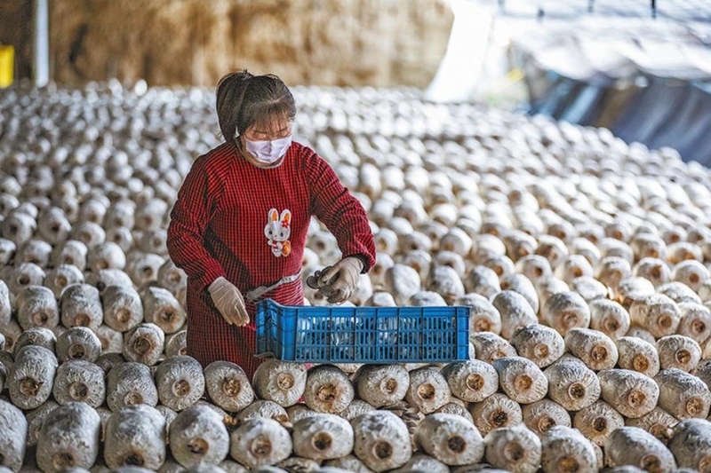 3月18日,华阴市华山镇杨寨村园英农作物种植农民专业合作社的大棚内,工作人员正在采摘食用菌。记者 雷沛 摄