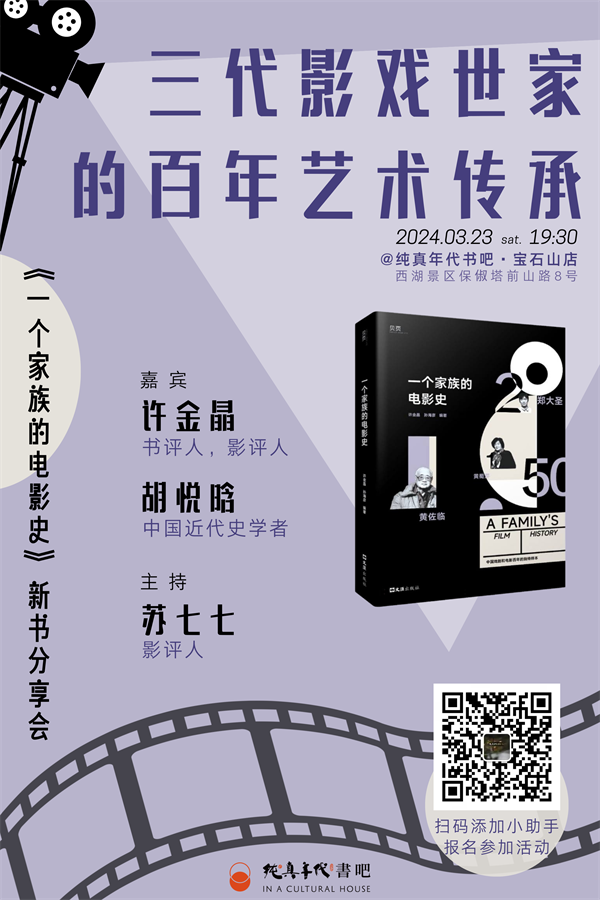 在长达一百多年的中国电影史长河中,有这样一个极具代表性的艺术世家,其家族三代的代表性人物,都活跃在中国电影与戏剧创作的一线,且一直从这种影戏之间的融合与互动中,获取丰富滋养。这个家族是:戏剧、电影导演黄佐临和演员丹尼夫妇,第四代导演的代表性作者黄蜀芹和电影美工师郑长符夫妇,以及当代艺术电影导演郑大圣和昆曲演员沈昳丽夫妇。2023年8月由贝页策划、文汇出版社出版的《一个家族的电影史》一书,正是完整呈现这一三代影戏世家艺术创作历程的一手文献合集。3月23日晚,纯真年代书吧将邀请本书主要编著者许金晶,与知名影评人苏七七、中国近代史学者胡悦晗,以线下对谈的方式共读这本《一个家族的电影史》,共同从三代影戏世家的家族艺术传承史当中,管窥中国电影与戏剧百年的发展演化以及百年中国的时代巨变。