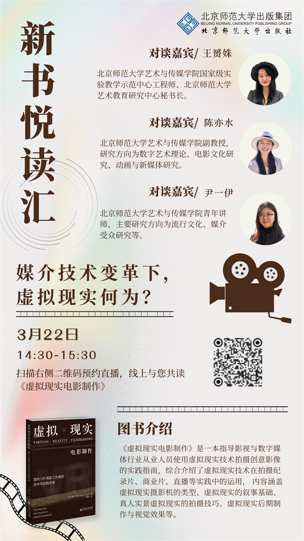 虚拟拍摄已经成了当下影视行业最热门的技术话题。与以往相比,当下正在发生的数字视觉技术革命,对传统电影所具有的颠覆性是前所未有的。在这场历史变革中,新技术与电影制作如何协作,如何获得可持续性的发展,或许是当下电影人所必须面对和思考的重要命题。基于此,《虚拟现实电影制作》一书应运而生!《虚拟现实电影制作》是一本指导影视与数字媒体行业从业人员使用虚拟现实技术拍摄创意影像的实践指南,综合介绍了虚拟现实技术在拍摄纪录片、商业片、直播等实践中的运用, 内容涵盖虚拟现实摄影机的类型、虚拟现实的叙事基础、真人实景虚拟现实的拍摄技巧、虚拟现实后期制作与视觉效果等。周五下午,我们邀请王赟姝、陈亦水、尹一伊三位嘉宾,从《虚拟现实电影制作》这本书出发,聊聊当下影视行业这一最热门的技术话题。
