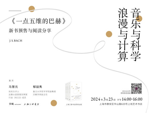 《一点五维的巴赫:音乐、科学和历史》是马慧元跨学科的音乐类散文集。3月23日下午,她将携新书,联手复旦大学哲学学院副教授、宗教学系副主任郁喆隽,共同光临上戏艺术书店,举办一场以“音乐与科学·浪漫与计算”为主题的新书预售与阅读分享沙龙。所有沉浸于音乐世界,渴求新奇知识的读者与观众,都将有望在此采撷不期而遇的收获。