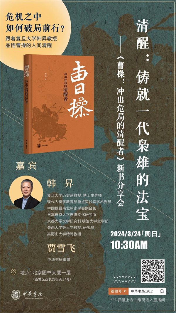 三国是一个动乱的时代,沧海横流方显英雄本色。曹操无疑是其中最闪耀的巨星之一。他为什么在危机四伏之中,总能破局而出?3月24日,复旦大学历史系韩昇教授将来到北京图书大厦,为读者带来“清醒:铸就一代枭雄的法宝——《曹操:冲出危局的清醒者》新书分享会”,从历史学、管理学、社会心理学的多重视角,解读一代风流人物曹操在乱世冲出危局的密码。