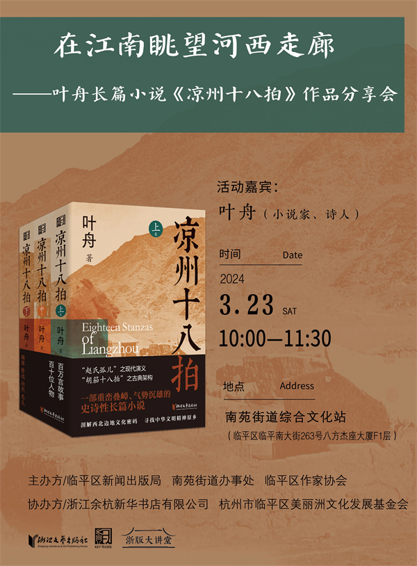 《凉州十八拍》是著名作家叶舟继提名第十届茅盾文学奖的长篇巨作《敦煌本纪》之后创作的又一部聚焦河西走廊历史文化的史诗性长篇小说。3月23日上午,叶舟将在杭州与江南读者面对面,漫谈西北浩瀚文化,分享创作心路。
