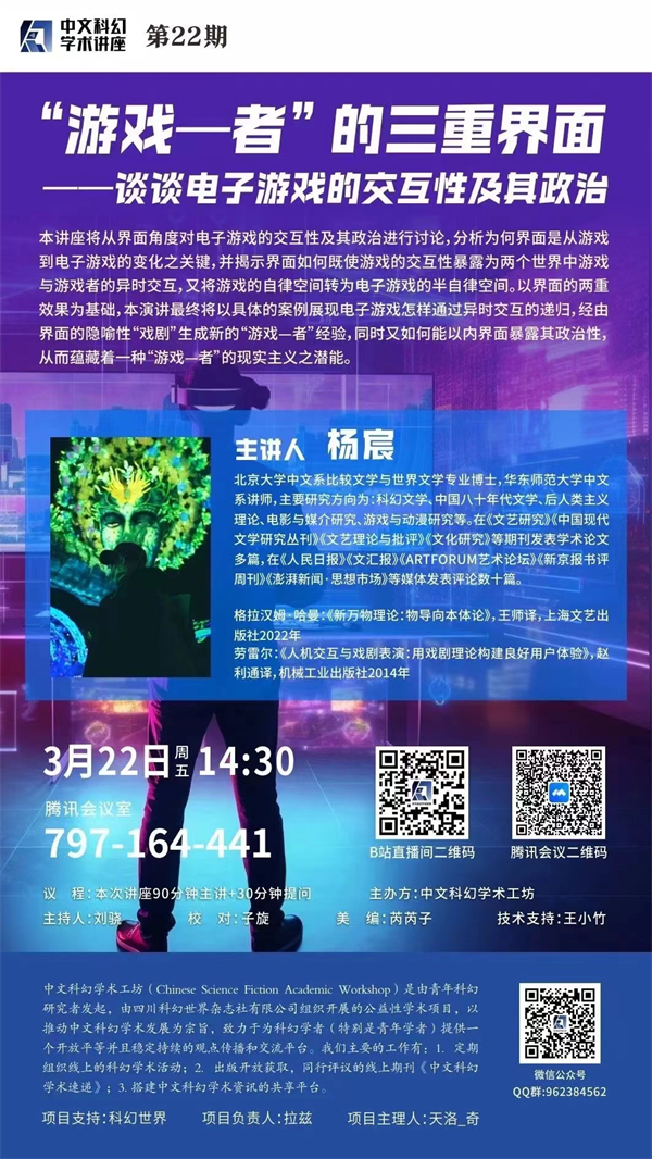 本讲座将从界面角度对电子游戏的交互性及其政治进行讨论,分析为何界面是从游戏到电子游戏的变化之关键,并揭示界面如何既使游戏的交互性暴露为两个世界中游戏与游戏者的异时交互,又将游戏的自律空间转为电子游戏的半自律空间。以界面的两重效果为基础,本演讲最终将以具体的案例展现电子游戏怎样通过异时交互的递归,经由界面的隐喻性“戏剧”生成新的“游戏-者”经验,同时又如何能以内界面暴露其政治性,从而蕴藏着一种“游戏-者”的现实主义之潜能。